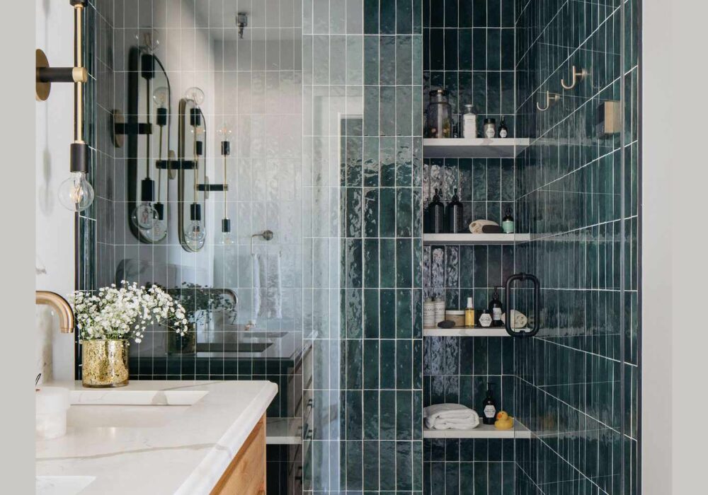 Built-in wall niches create storage directly inside bathroom walls. This design often appears inside showers or beside the vanity.